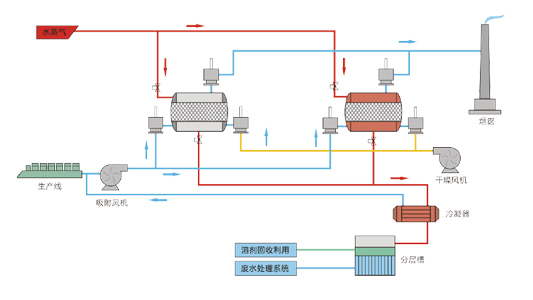 吸附回收主要是利用吸附材料將廢氣中的有機溶劑吸附下來,并脫附回收利用有機溶劑的方法。
